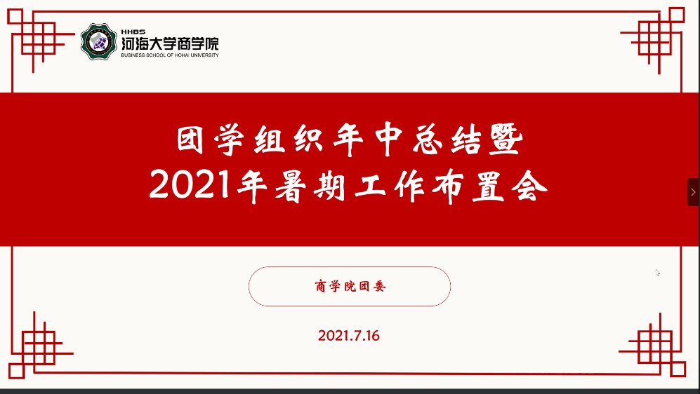 2021年7月16日,国产无码 团学组织年中总结暨2021年暑期工作布置会在线上召开。国产无码 团委书记陈璐老师主持会议,2021级辅导员陈鹏、魏俊美老师出席了本次会议。各团学组织主席团及预备主席团成员40余人参加了此次会议。