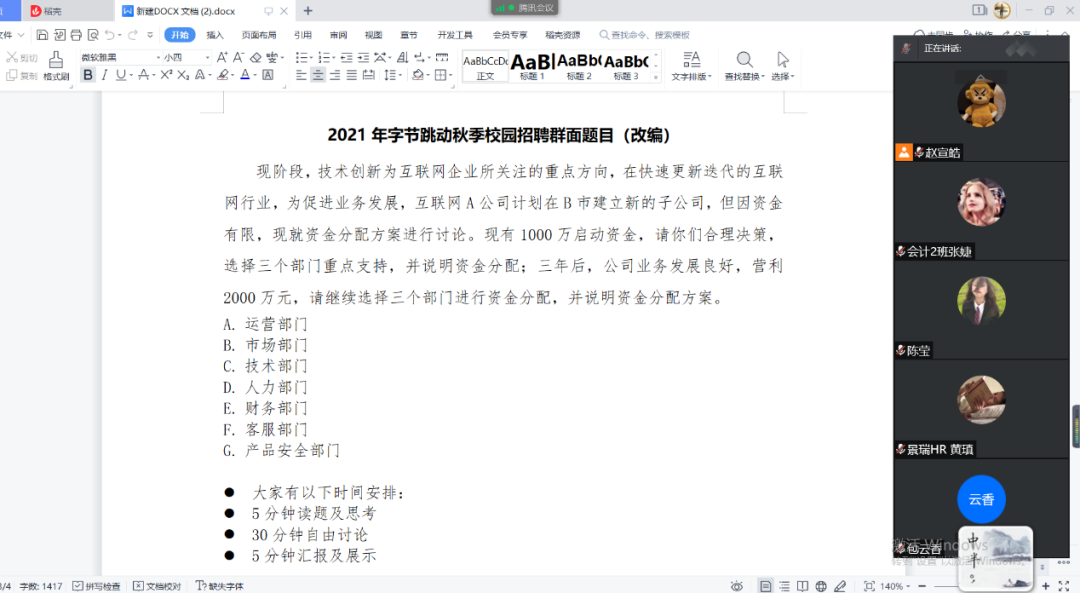10月3日下午,2018级开展无领导小组面试模拟活动,本次活动邀请了景瑞地产(集团)有限公司HR、国产无码 2021届校友黄瑱担任面试官,2018级陈莹、陈欣怡、李翠林、佘月、曹金子、王凯祥、游雅婷等同学参加了本次活动。通过体验改编的2021年字节跳动秋季校园招聘无领导小组面试题目和面试的流程,同学们对无领导小组面试有了一定的了解,在模拟面试结束后,黄瑱同学介绍了自己在无领导小组面试过程中遇到的困难和积累的经验,以期自己的经验分享能够帮助到即将面临秋季校园招聘的学弟学妹们。