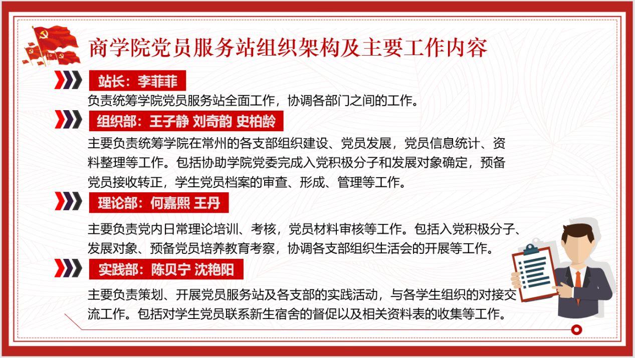 学院党员服务站主要学生干部围绕组织架构、工作成就、工作计划以及发展党员工作流程等内容展开了详细讲解。进一步明确党员服务站的工作宗旨与工作方向,切实做到把学院党建工作经验学习好、总结好、传承好、发展好,努力在“办实事,开新局”上创造成效。