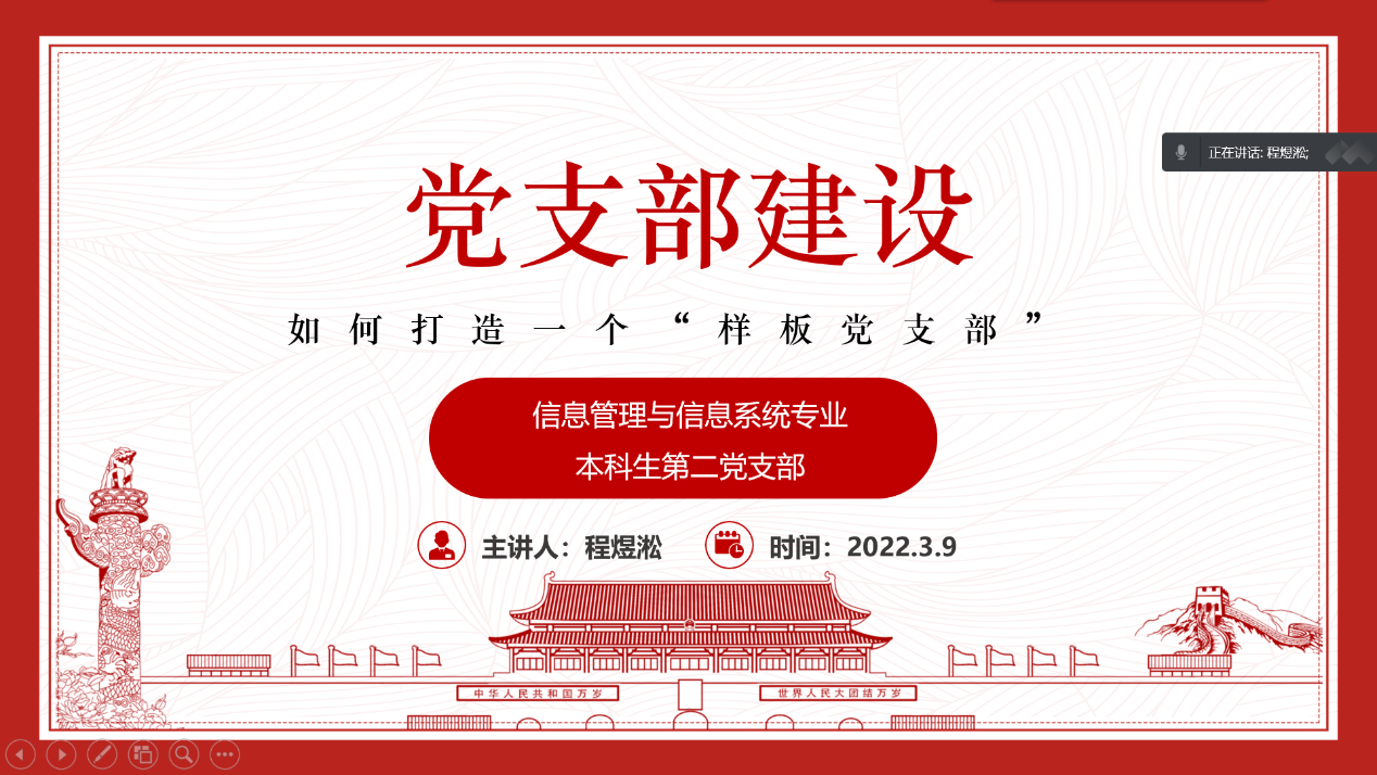 信息管理与信息系统专业本科生第二党支部副书记程煜淞以“如何打造一个样板党支部”为主题对2021年度党支部建设经验进行了分享。每名党员同志都应牢记初心使命,自觉主动做好分内工作,发挥模范带头作用,永葆党员的革命本色。党员的发展离不开党支部的培养教育,党支部的建设也离不开党员的支撑助力,二者相互促进,相互依赖。