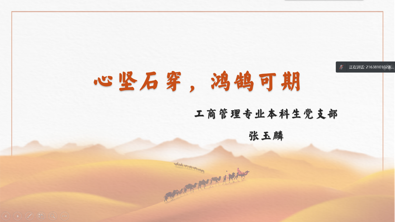 工商管理专业本科生党支部入党积极分子张玉麟同学从思想转变、总结反思、未来打算三个切入点分享了个人发展规划。她对党的认识,是从懵懂好奇到心向往之的,再从心向往之到坚定信念的,是日趋深化的,是渐加坚定的。她认为,只有不断在反思中进步,持续在摸索中成长,才能不断的向党组织积极靠拢。