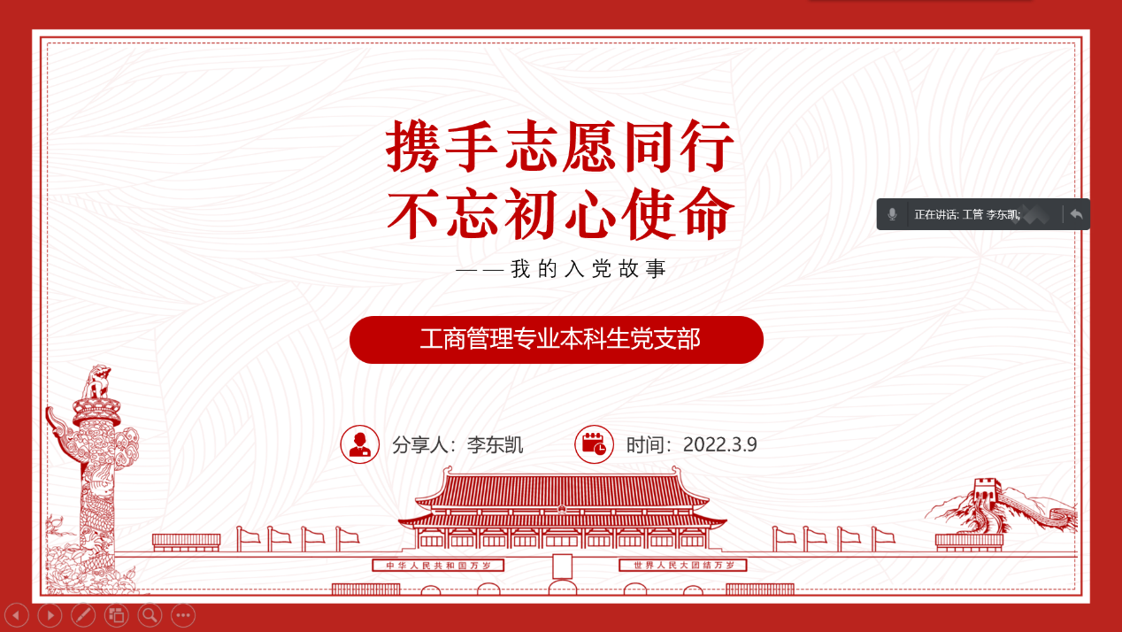 工商管理专业本科生党支部党员李东凯同志从入党初心、志愿践行和信念坚定三个部分分享自己的入党故事。用现身说法为大家展示了入党动机和理想信念是如何通过志愿服务实现由萌发到成熟,再到坚定的过程,鼓励入党积极分子坚持批评与自我批评,积极参与志愿服务,不断坚定理想信念。