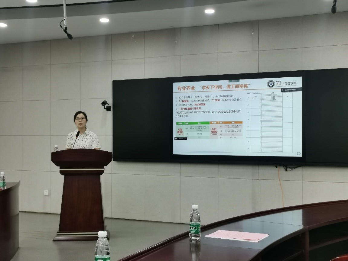 教师代表聂志萍老师多次参与学校、学院本科招生宣传工作,聂老师结合自己的招生宣传经历,向与会老师分享了“如何与家长、学生沟通”、“如何锁定目标生源”等方面的经验。
