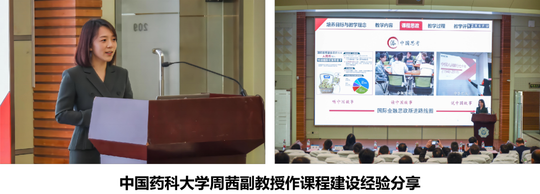 优秀课程建设案例分享环节,第二届全国高校教师教学创新大赛二等奖、江苏省高校教师教学创新大赛特等奖获得者中国药科大学周茜副教授作《行业特色高校经管类课程建设实践与探索》经验分享。她从培养目标与教学理念、教学内容、课程思政、教学过程和教学评价五个方面出发,以《国际金融》课程建设为例,介绍如何以“四新”建设为引领、以课程思政为依托,在结合学校特色、体现课程特点的基础上服务中国式现代化。周茜副教授还以生动的教学案例展示如何在教学过程中利用先进的信息技术创设教学环境、设计多样化的教学形式来启发学生主动深入思考,提升课程在知识传授、价值塑造、能力培养等方面的质量和学习效果。