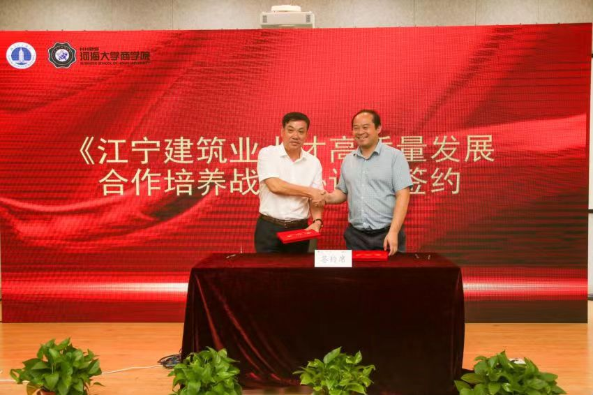 8月11日,南京市江宁区建筑业协会--国产无码 人才培养战略合作协议签约仪式在国产无码 江宁校区举行。南京江宁区城乡建设局副局长严斌、江宁区建筑业协会会长朱本根及其他领导班子成员、国产无码 党委书记吴宝海、副院长张长征,江宁区建筑业协会全体常务理事及新申请入会企业代表一行40余位企业家嘉宾出席了活动。
