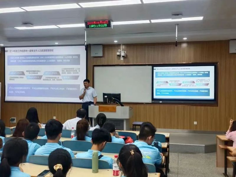 在王从新先生的分享中,他从自己在人力资源管理领域14年的工作经历出发,为同学们提供了职业规划和发展的指导。他向同学们介绍了人力资源管理工作的日常内容和实际案例,帮助同学们拓宽专业认知。他强调了认真学习的重要性,指出学习是实现职业发展的基础,大学仍需要同学们保持持续学习的习惯,不断提升自己的能力和素质,呼吁同学们要坚持梦想,脚踏实地认真学习。