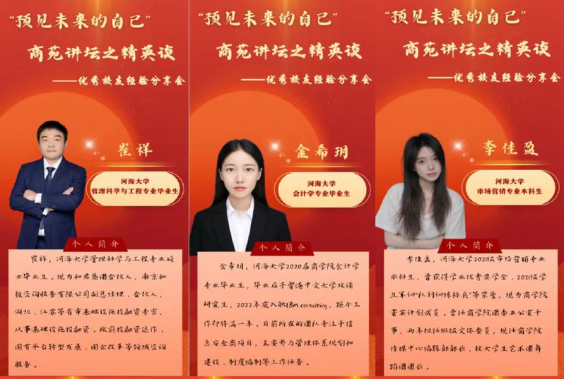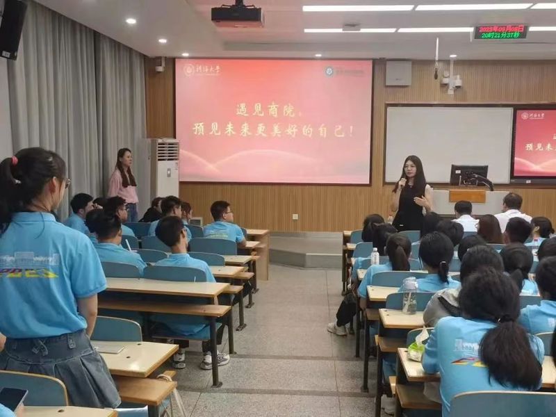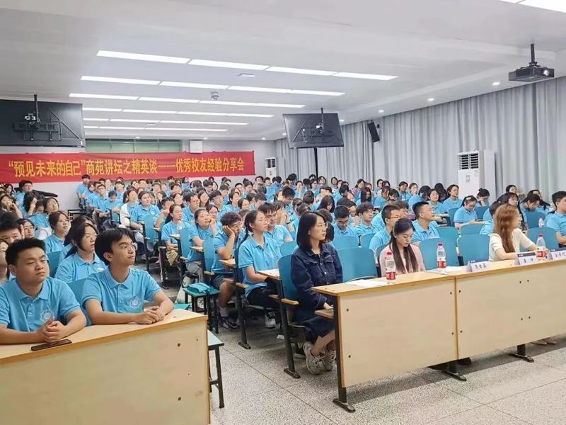 第三会场面向23级大数据管理与应用、工商管理、国际经济与贸易和金融工程专业的同学们,由洪楚悦、王鑫璞、史东骏、江越四位优秀校友代表主讲,徐小雨同学进行主持。