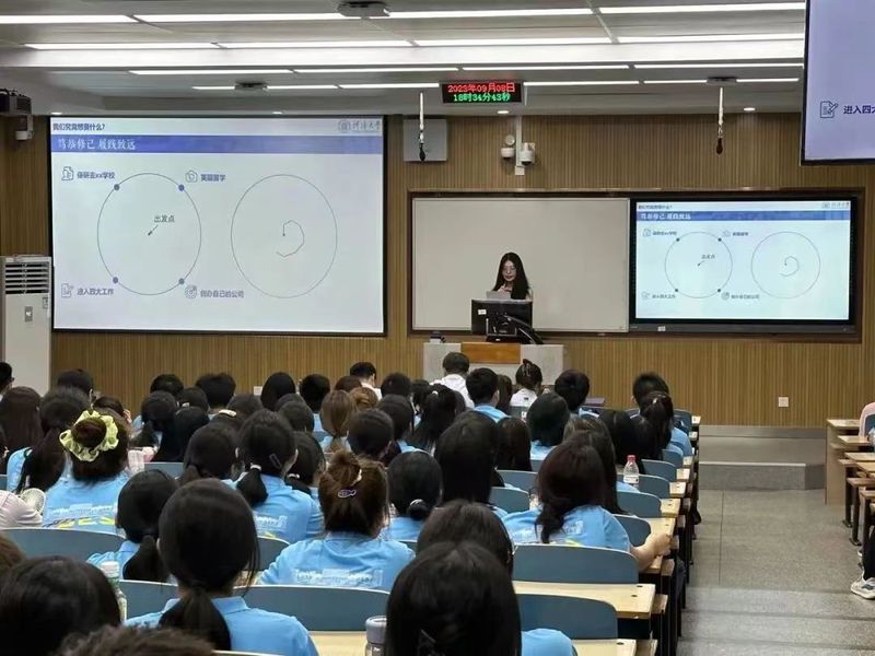 严瑾同学带领同学们回顾了她过去三年中学习生活、竞赛和实践活动的经历,展示了明确目标、躬身实践、把握节奏对于取得成果的重要性。她强调了设定明确的短期和长期目标的重要性,帮助新生们明确自己的追求,并制定相应的计划与行动步骤。她还分享了关于未来求学和就业方向的思考,鼓励新生们积极探索自己的发展方向,创造出属于自己的辉煌。