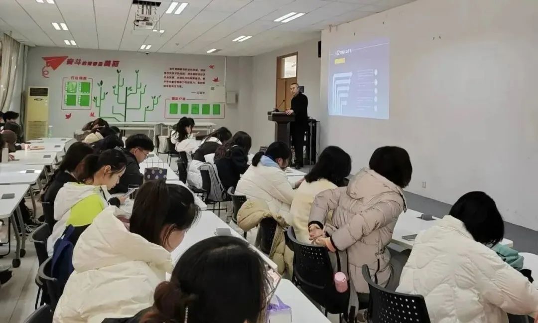 讲座伊始,滕景轲老师首先向同学们展示了自己从国企优秀员工转向自主创业的工作及创业历程,指出在不同工作岗位上的发展收获为他后续的创业工作奠定了重要的基础。随后,滕老师说明,创业伙伴的选择是相互的,自身的优秀能力以及人脉的积累十分重要。