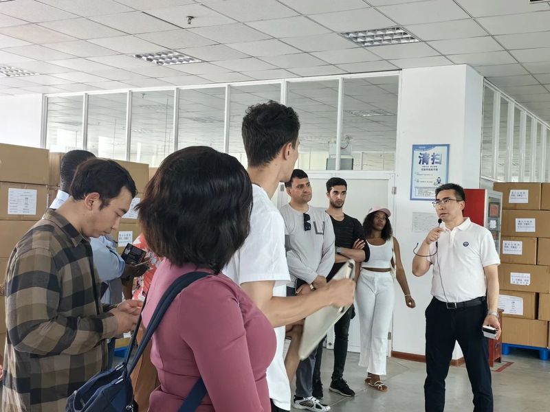 活动伊始,汇鸿中嘉公司副总经理董入明先生带领留学生们参观研发基地并实地体验了公司纺织产品的生产过程。留学生们观摩学习了毛针织产品的整个生产流程,从设计打样到织造生产,再到后期整理,同学们被先进的生产工艺和精细的产品设计深深吸引,纷纷向董入明先生提问,了解每一个环节的细节。通过此次观摩学习,同学们对毛纺织品生产有了更为直观的认识和思考。