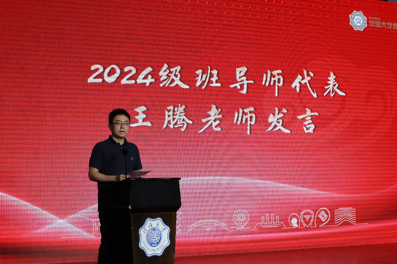 王腾老师作为新生班导师代表发言,满怀热情地向2024级新生们敞开怀抱,欢迎新同学加入充满活力的商院大家庭,他从大学生活的本质和特点的角度出发,鼓励同学们在大学阶段勇于探索,成为精彩大学生活的创造者、思考者、实践者。