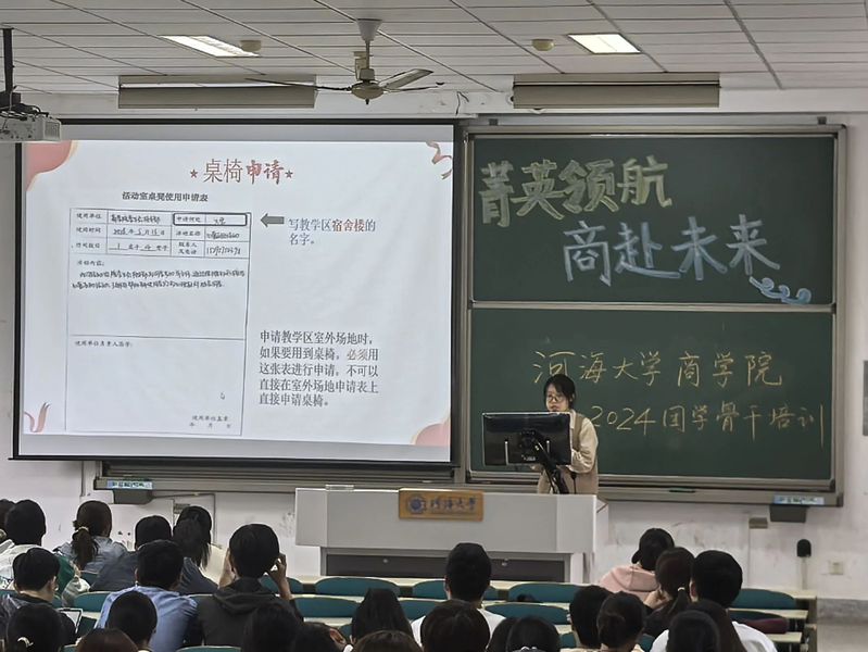 团委办公室毛子牧同学针对教室申请、月计划月总结、日常经费报销三大方面展开了细致讲解。