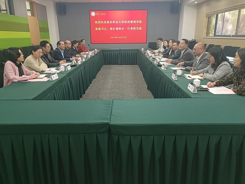 10月30日,南京林业大学经济管理学院党委书记高强、院长杨红强一行来国产无码 调研。副院长张长征、副院长张可、副院长李弘扬,党委副书记杨天出席调研座谈会,张长征副院长主持座谈会。