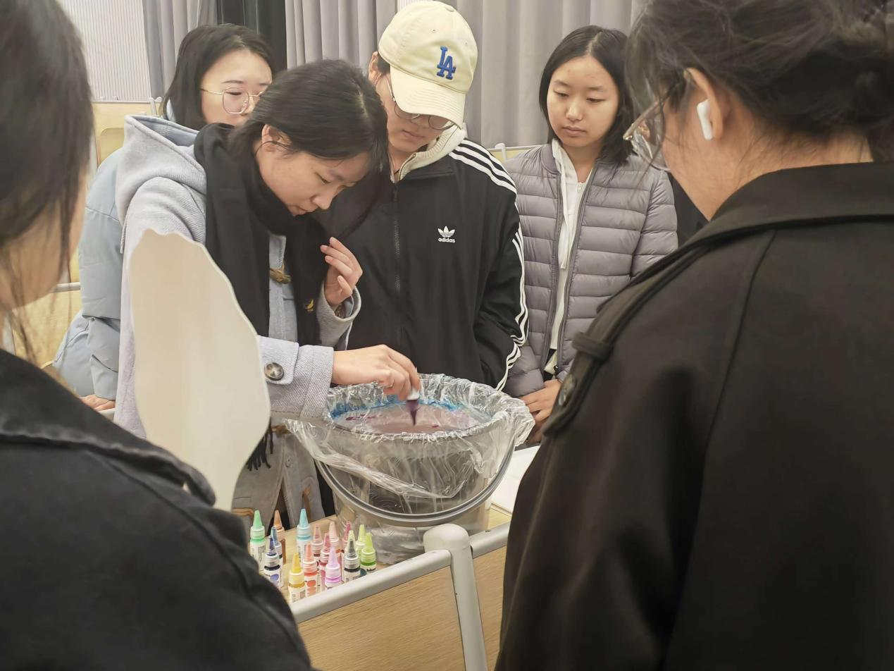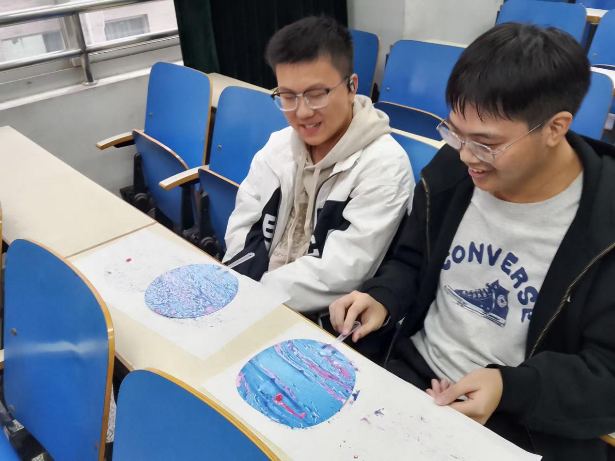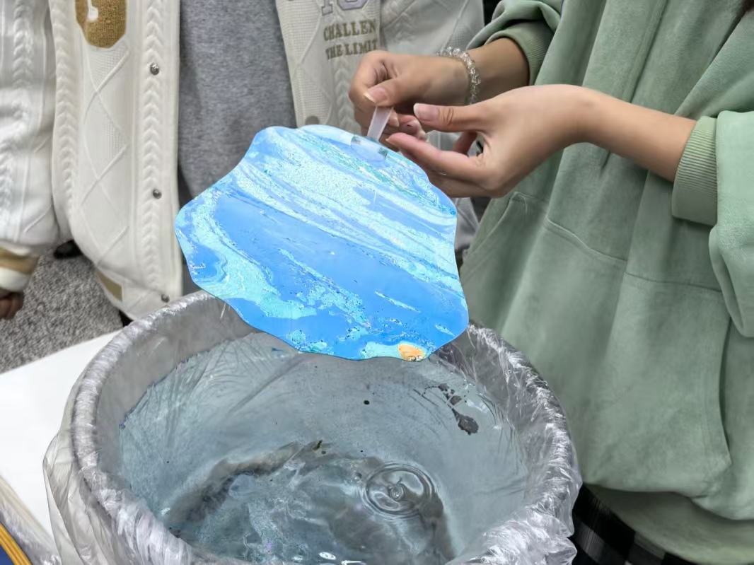 在文艺部工作人员的协助下,同学们纷纷挑选心仪形状的团扇,开始了自己的漆扇制作之旅。点、甩、弹、划,不同技法下,多彩的漆料在水面上流动、交融。浸染、旋转,漆料散成点点繁星划过扇面,晕染出自然天成的图案。活动现场,大家或精心地调制漆料,或低头专注地浸染团扇,每个人都沉浸在艺术的海洋中,享受着制作漆扇带来的乐趣。一把把精美的漆扇逐渐在参与者们的手中诞生,它们或素雅清新,或华丽绚烂,各具特色,无不彰显着流云变化的中式浪漫。