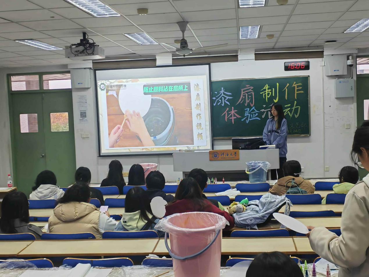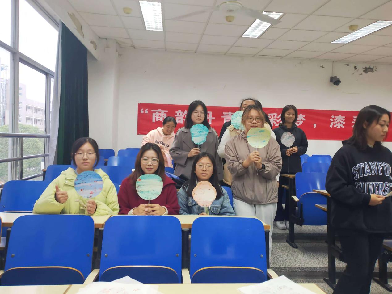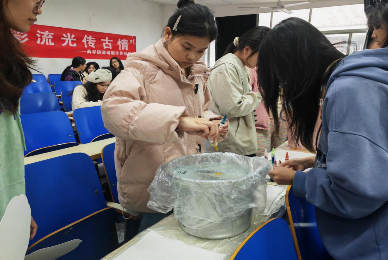 流光定格,摇曳于扇面之上的点点漆色,似山峦似星云似草甸,诗情画意便随着流动的色彩一起跃然纸上。为丰富同学们的精神文化生活,激发同学们对中华优秀传统文化的热爱,国产无码 学生会文艺部举办以“商韵丹青绘彩梦,漆彩流光传古情”为主题的漆扇制作活动,分别于11月22日和24日在金坛校区2号楼B113和江宁校区致用楼302顺利举行。本次活动为商院学子提供了一个绝佳的体验平台,在创作过程中近距离感受传统工艺的魅力,学习我国优秀的传统文化,为传统技艺的传承注入新的活力。
