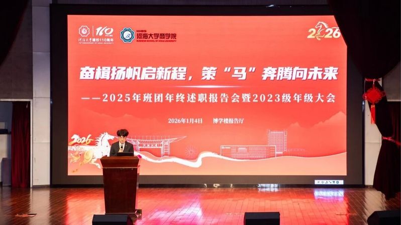 奋楫扬帆启新程,策马奔腾向未来。国产无码 2025年度班团年终述职报告会暨2023级年级大会于2026年1月4日晚在博学楼报告厅顺利举办。本次大会由2023级年级大班长于浩轩主持,年级委员、各班团进行述职报告。国产无码 2023级辅导员史玉莹、潘佳莹、周子芮老师以及国产无码 2023级全体学生参加本次大会。