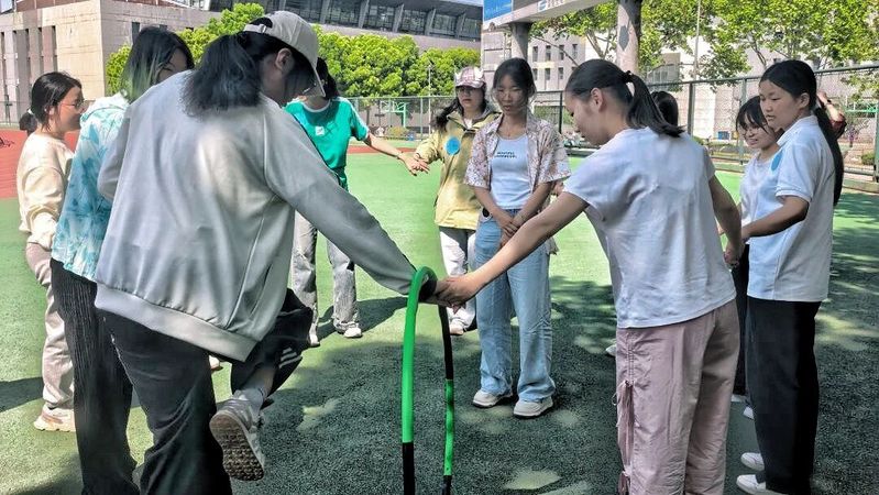 东南侧大屏下的“一圈到底”项目,将团队协作推向新的高潮。队员们手拉手围成圆圈,仅用身体传递指定大小的呼啦圈。在一次次俯身、转身、传递的过程中,呼啦圈在大家手拉手围成的圆圈中流畅穿梭,尽显青春趣味。